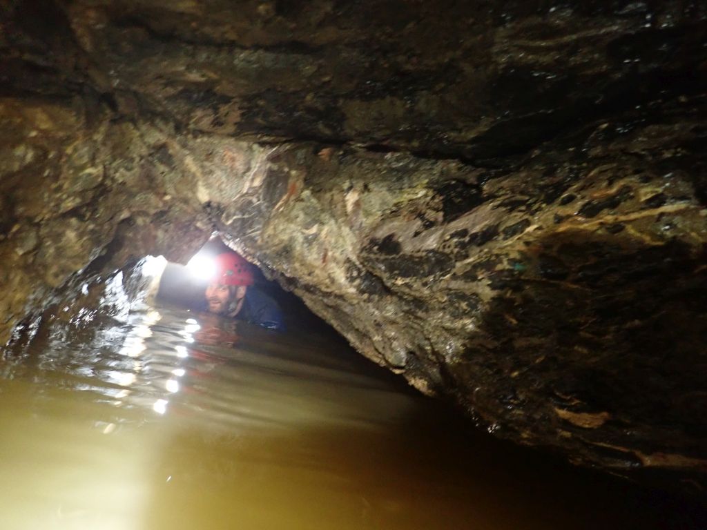 Having skated down the road we entered the nicely warm cave and followed down to the stream way. Usually going last means a little more airspace in the canal, sadly not this time as the feeder stream was topping it up as fast as it was sloshed over the dams at the end.