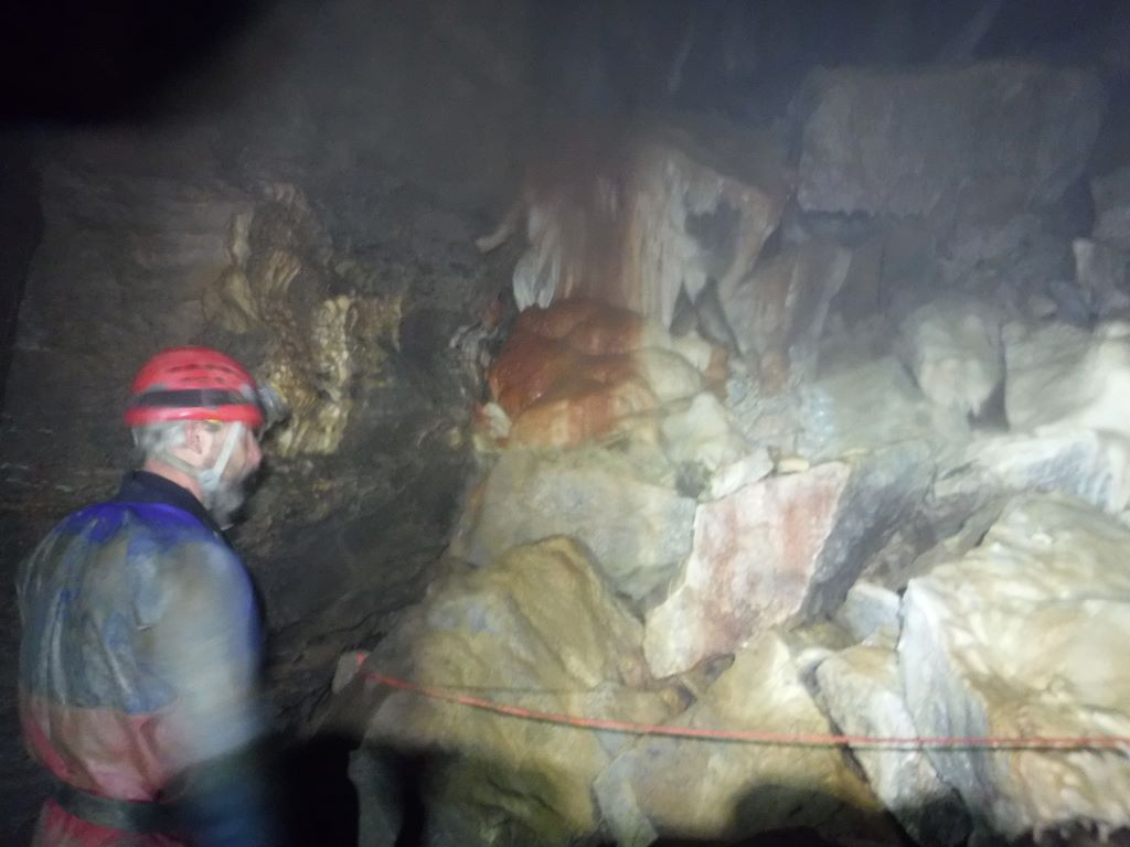 This time we went straight ahead down a passage with a couple of squeezes to arrive at the top of The Forty Backs a 15m snug pitch which we descended by ladder and lifeline to Masters’ Aven a 40m high, very loose chamber where we admired the fine (and perfectly preserved) mud formations.