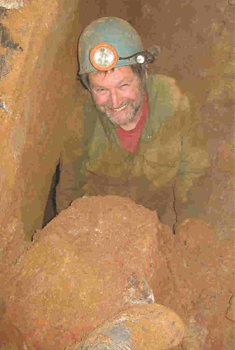 Damocles Rift Damocles passage is off the northwest corner of Sand Chamber in the Adventure Caving Area of Gough's Cave. It is a high rift passage heading almost due north, and after 30 metres ends in a boulder ruckle. This can be climbed for about 6 metres to a chamber leading to two ways on. One, to the right, wriggles through boulders for another 20 metres but does not appear to go anywhere, although it has not been thoroughly looked at. The other, to the left, leads to a muddy slope with scalloping in the roof, formerly terminating in a boulder choke. and this was our chosen site. Descriptions of caves are usually difficult to follow without a survey, and although we don't have a decent one of the dig, it doesn't matter. Just keep a mental image of a way going almost vertically and you won't go far wrong. It had been looked at before. In the early 80s the BEC did some banging, bringing a few rocks down but apparently lost interest, despite the flowmarks. I had been told that 200 feet of passage had been found but a collapse had blocked the way on, which gave initial excitement. However, our investigations, plus some personal communication with one of the earlier diggers, showed this to be slightly inaccurate, it was more like 2 feet. The club first had a look-see on 28th May 2000 after which it was agreed to fund the dig and I obtained the necessary permission but it was to be over a year before work started. To be continued….